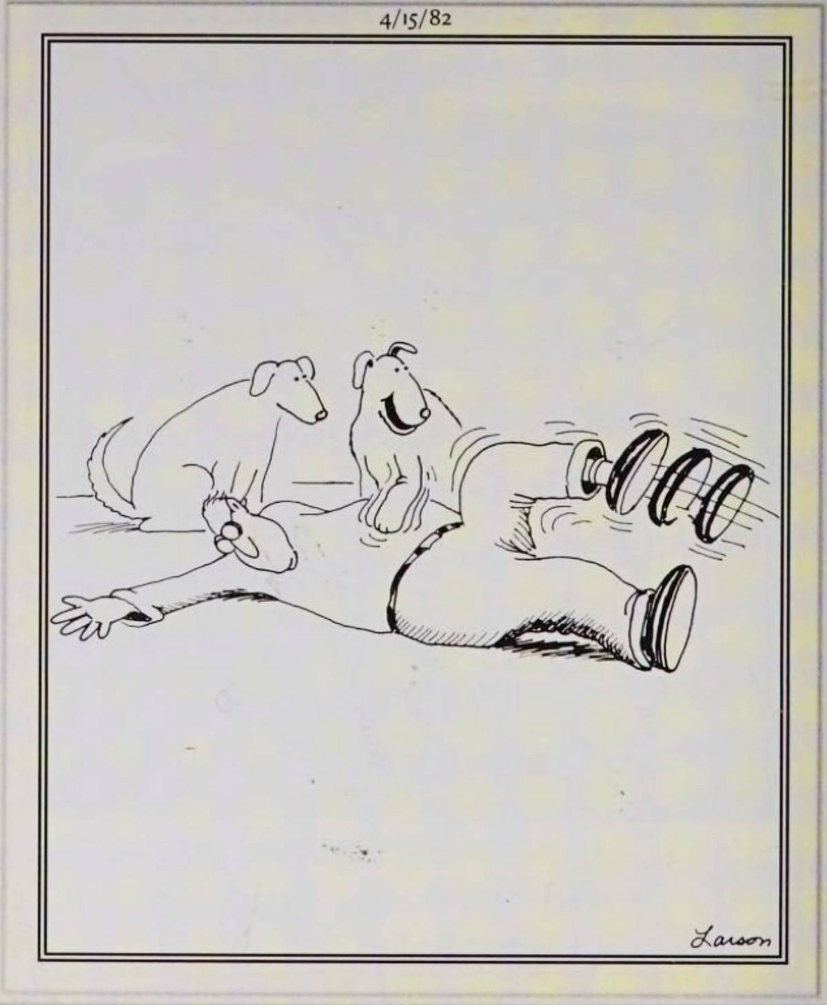 The human possesses the same natural reflexes as a dog, which means they have something surprising in common with one another. Moreover, the dog looks delighted by this revelation, and the scene unfolding could be bringing them closer together. Many Far Side comics portray dogs and other pets seeking revenge against their owners out of malice, so it's a refreshing change of pace to see them bond here.