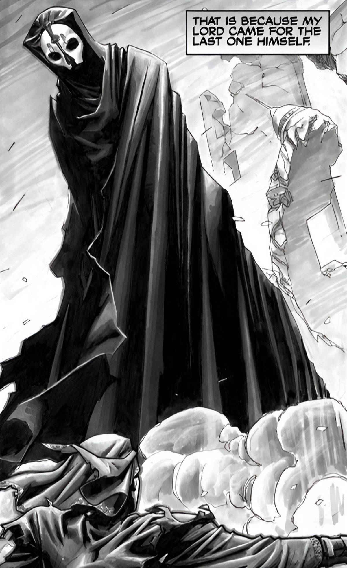 Thus, Nihilus became more akin to a force of entropy. Any who gaze upon the Sith Lord's mask will soon perish. His voice is the last to be heard before their souls are consumed. For many, as his name suggests, Darth Nihilus is an inevitable force of nature that cannot be stopped. His mask is the face of death, even to those who are unable to see it. In his shapeless shrouded form, Nihilus is stripped of his humanity, leaving the visage of Death as his only identity.