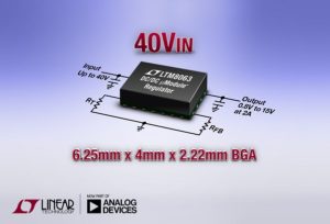Analog Devices, Inc., which recently acquired Linear Technology Corporation, announces the LTM8063, a 40VIN, 2A µModule® step-down regulator in a tiny 6.25mm x 4mm BGA package. The package size is 75% smaller than the existing equivalent product. With two 0805 size capacitors and two 0603 size resistors, the solution is only 70mm². The Silent Switcher® architecture minimizes EMI emissions, enabling the LTM8063 to pass the CISPR 22 class B EMC standard.