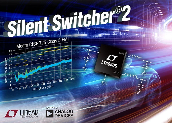 Analog Devices, Inc., which recently acquired Linear Technology Corporation, announces the LT8650S, a dual 4A, 42V input synchronous step-down switching regulator. It’s unique Silent Switcher®2 architecture uses four internal input capacitors as well as two internal BST and a single INTVCC capacitor to minimize the area of the hot loops. Combined with very well controlled switching edges and an internal construction using copper pillars in lieu of bond wires and an integral ground plane, the LT8650S’s design dramatically reduces EMI emissions. This improved EMI performance is not sensitive to PCB layout, simplifying design and reducing risk even when using two layer PC boards. The LT8650S can easily pass the automotive CISPR 25, Class 5 peak EMI limits with a 2MHz switching frequency over its entire load range. Spread spectrum frequency modulation is also available to lower EMI levels further.