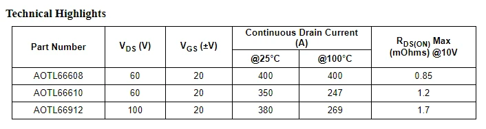The AOTL66608 (60V), AOTL66610 (60V), and AOTL66912 (100V) have a 30% smaller footprint compared to a TO-263 (D2PAK) package and has a higher current capability which enables the designer to reduce the number of MOSFETs in parallel. The new device’s offer a higher power density compared to existing solutions.