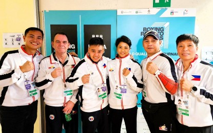 PARIS-BOUND. Boxers Nesthy Petecio (3rd from left) and Aira Villegas (3rd from right) pose with Association of Boxing Alliances in the Philippines (ABAP) officials during the 1st World Qualification Tournament in Busto Arsizio, Italy last week. Others in photo, from left are ABAP secretary general Marcus Manalo and coaches Don Abnett, Reynaldo Galido and Mitchell Martinez. (Contributed photo)