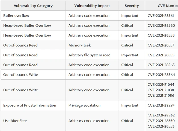 The company also addressed three critical Out-of-bounds write issues in InDesign (CVE-2021-21098, CVE-2021-21099, CVE-2021-21043) that could lead to arbitrary code execution.