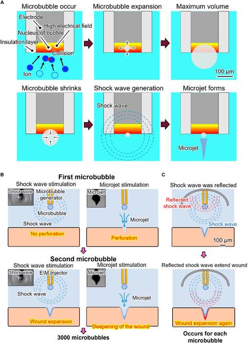 The injection mechanism operates in a cyclic fashion wherein each voltage pulse initiates a sequence of microbubble generation, expansion, contraction, and shock wave emission. Initially, the shock wave induces tissue vibration without causing damage. Subsequently, the microjet that forms punctures the tissue, initiating a controlled permeation. Repeated pulses then propagate this effect, enlarging and deepening micro-perforations through tissue vibration induced by successive shock waves. The research team conducted up to 3,000 such cycles to ensure effective tissue injection, reflecting meticulous control over the dynamic process and ensuring reproducibility.