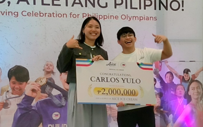 MORE INCENTIVES. Aice Philippines brand manager Shereene Yu De Leon awards a mock check representing PHP2 million as an incentive to gymnast Carlos Yulo for winning two gold medals at the Paris Olympics during the "Saludo, Atletang Pilipino!" thanksgiving celebration for the Philippine Olympians at the Holiday Inn & Suites-Lima Park and Aice factory in Malvar, Batangas on Thursday (Sept. 26, 2024). Boxers Nesthy Petecio and Aira Villegas received PHP300,000 each for securing bronze medals. (PNA photo by Jean Malanum)