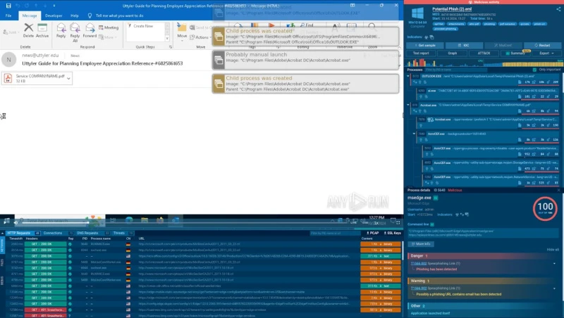The system automatically opens the .eml file submitted by the user via Outlook, detects a PDF attachment, and scans its contents.
