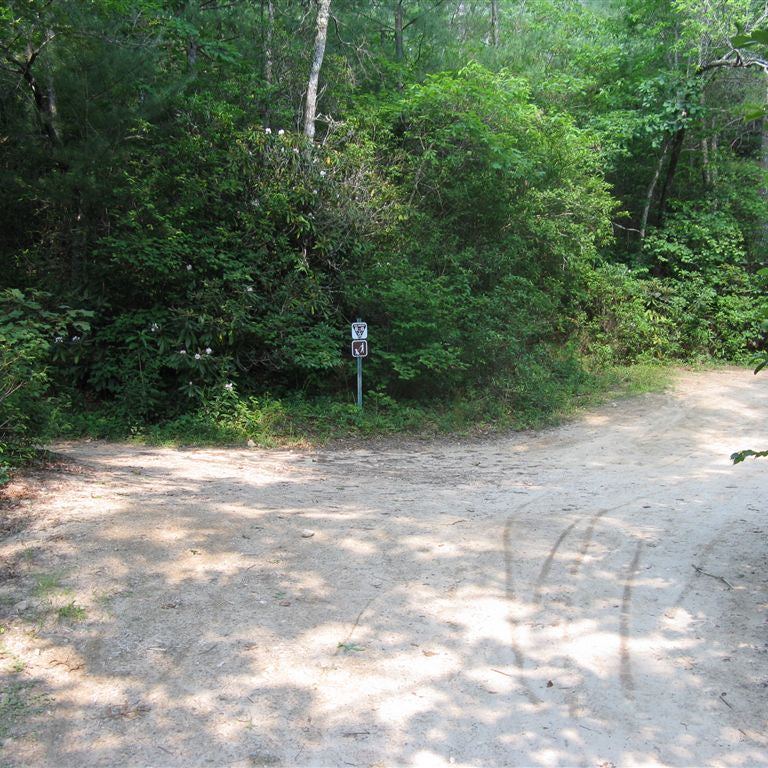 Turn right @ 3-way intersection into a gap. Just ahead, the road splits and the Art Loeb Trail continues to the right.