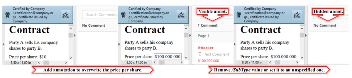 Victims opening the PDF are unable to distinguish these additions from regular content. And even worse: annotations can embed high privileged JavaScript code that is allowed to be added to certain certified documents.