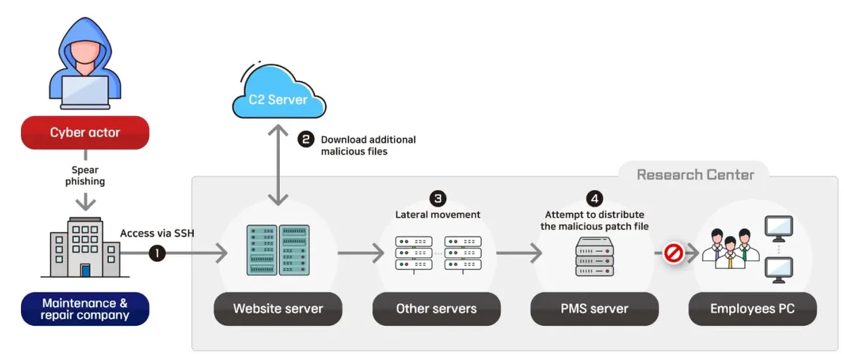 In late 2022, a North Korean cyber actor breached a maritime research center’s systems via a supply-chain attack, which later expanded control through a patch management system.