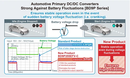 ROHM’s new products suppress voltage overshoot to less than 1/10th of that of conventional products when the input voltage drops below the output set voltage, keeping the output voltage to the specified voltage before fluctuation occurred. This allows users to eliminate additional capacitors typically required as a countermeasure for overshoot, ensuring stable operation even in the event of sudden battery voltage drop (i.e. cranking).