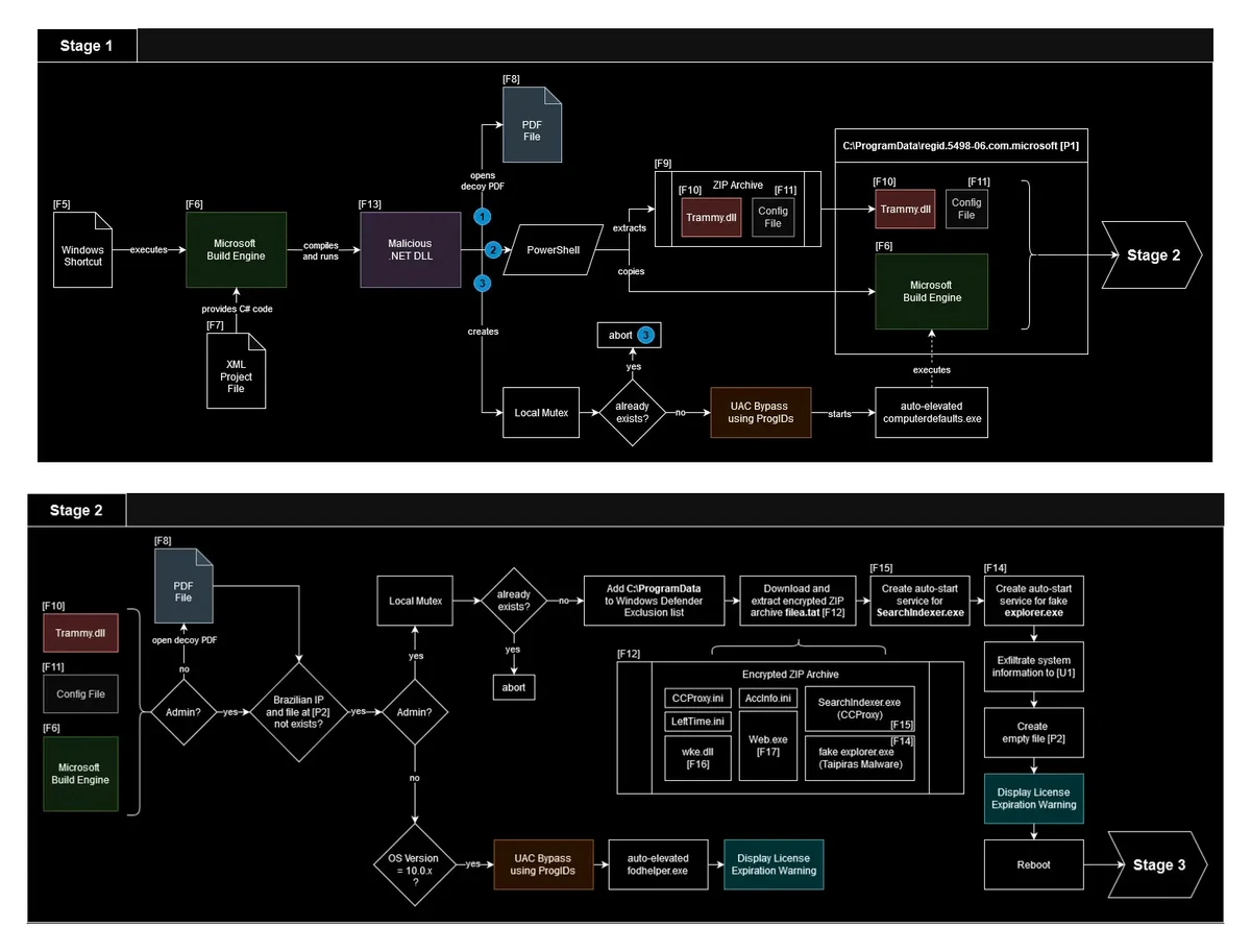 It first opens a decoy PDF file, and then verifies two conditions before proceeding, “absence of a specific file (C:\ProgramData\internal_drive_version2.3.4.txt),” and “confirmation of a Brazilian IP address.”The malware logs its activities in “C:\ProgramData\log.txt,” using keywords like “START” and “ADMIN” to indicate progress.