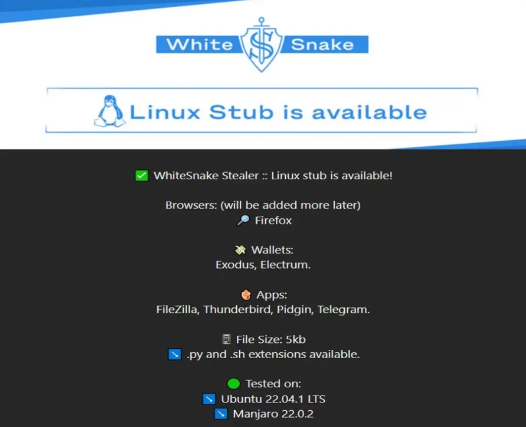 The cybercriminals have recently shared an advertisement screenshot, revealing the availability of WhiteSnake Stealer for Linux OS. Interestingly, the Linux variant offers the same range of features and capabilities as its Windows counterpart.