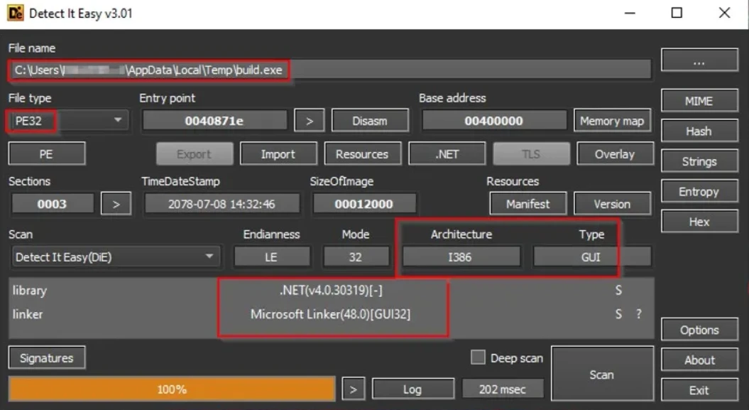 The WhiteSnake Stealer is a .NET executable binary that is based on a 32-bit GUI and it’s disguised under “build.exe” payload.
