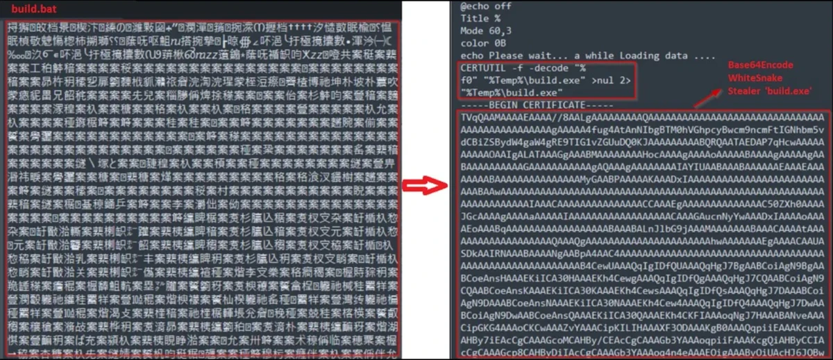 There are traditional Chinese characters displayed in a text editor when the file “build.bat” is opened. There is an executable Binary encoded in Base64 that has been included between digital certificates within the decoded BAT file.