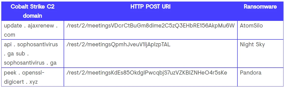 There is a common C2 address shared by all three attacks using AtomSilo, Night Sky, and Pandora in the configuration of Cobalt Strike beacons.