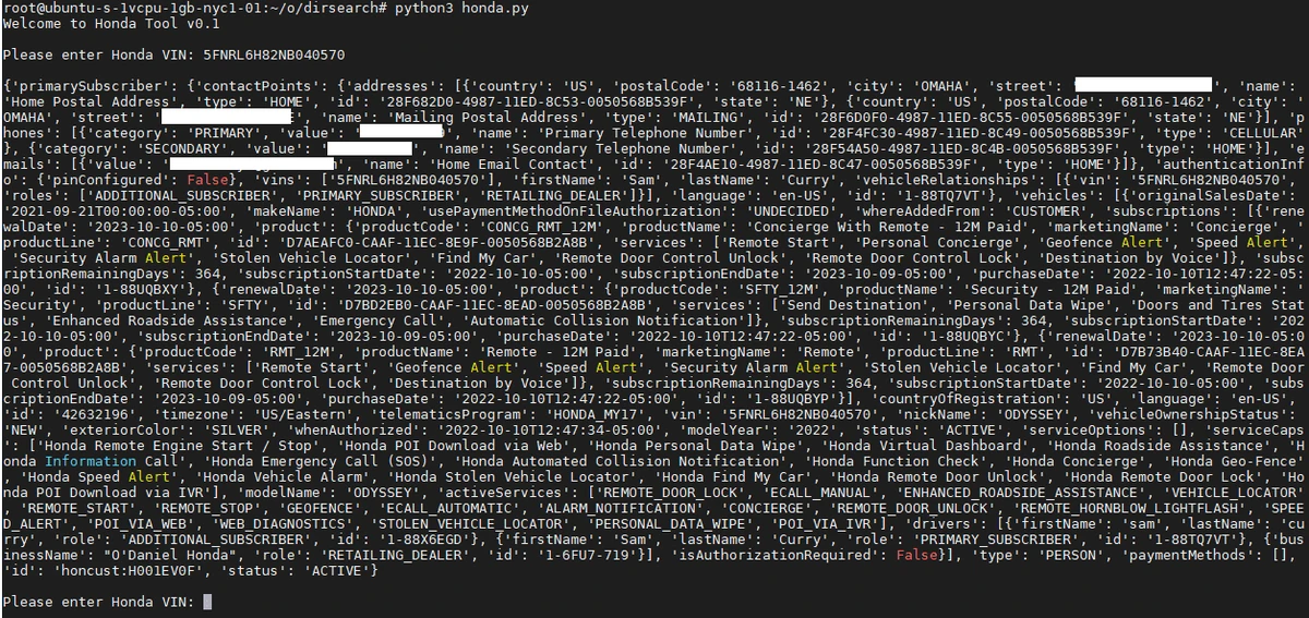 “Further analysis of one of the HTTP responses researchers saw the following format of a VIN number: vin:5FNRL6H82NB044273, This VIN format looked eerily similar to the “nissancust” prefix from the earlier HTTP request. What if we tried sending the VIN prefixed ID as the customerId?” The researcher said in his tweet.