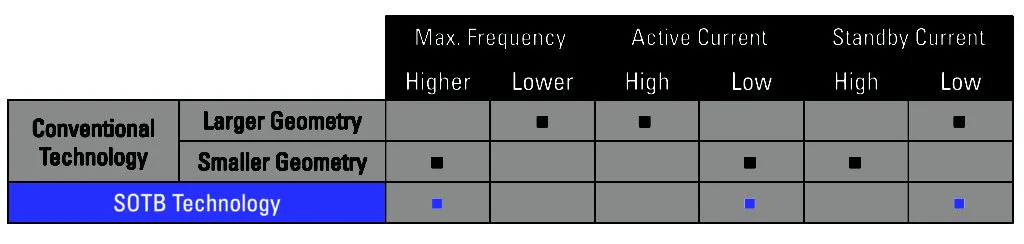 SOTB is a dopantless design in which the gate characteristics are controlled by the extremely thin isolation layer within the gate, which itself is extremely well controlled. This means that the variation between each gate is much lower than with the traditional bulk silicon gate design. This reduction in the variation between gates on a SOTB device allows us to greatly reduce the operating voltage and hence the energy used to switch the gate. The result of this is the extremely low active power consumption of devices implemented on the SOTB process compared to devices implemented in a traditional bulk silicon process.