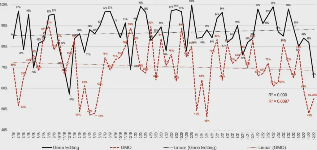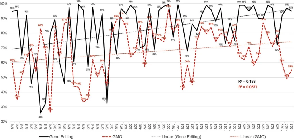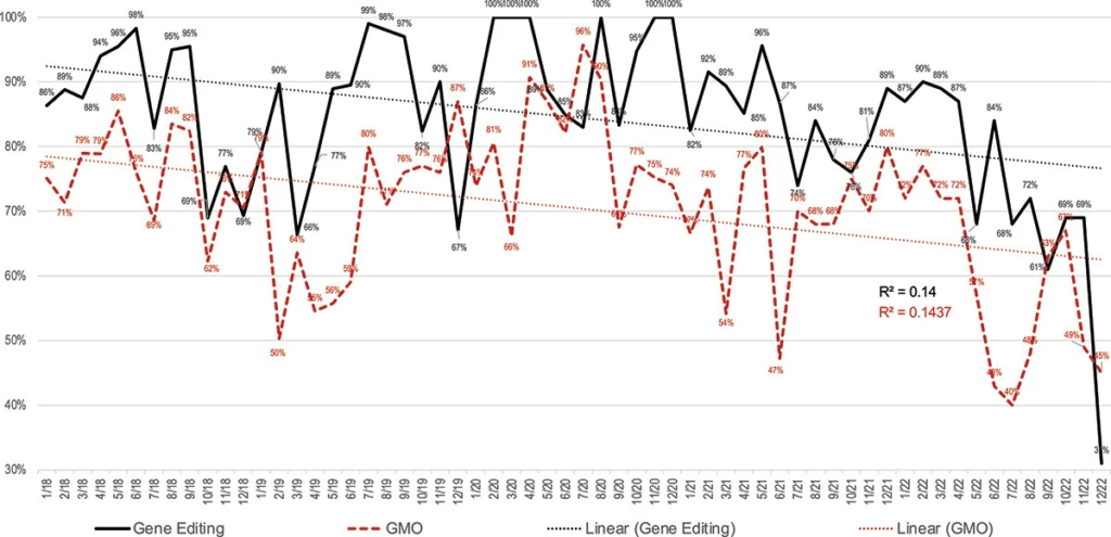 It is notable too that there are also no occasions with 100% positive favorability coverage of GMOs, which has been the case for gene editing, particularly through 2020. Although we have not performed a statistical analysis of the relationship between the two lines, a visual inspection indicates that the peaks and troughs do match on various occasions, suggesting that media coverage of gene editing and GMOs is not completely separated. Note also that the trendlines for both GMOs and gene editing show a relatively strong downward trend for the entire 5-year period as evidenced by high R2 numbers. Interestingly, the trendline slopes for both issue areas are almost exactly the same.