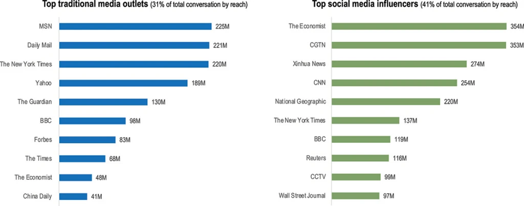 Figure 5 shows the top 10 traditional media outlets by reach in our analysis, and the top social media influencers. Note the substantial overlap, in that the top traditional media outlets are heavily represented on social media with accounts with the highest reach on our issues, so the conversations are not entirely distinct. Note also the substantial reach of Chinese state-owned outlets, particularly in social media, with CGTN (China Global Television Network), Xinhua News and CCTV all in the top 10, and China Daily in the top 10 of traditional media outlets also. To our knowledge, this has not been noted elsewhere, and indicates the increasing penetration of English-language Chinese state media internationally.