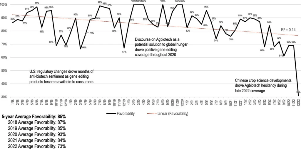 Figure 6. Favorability analysis of social media coverage of gene editing and GMOs 2018–2022. GMO sentiment is indicated by the red dashed line.