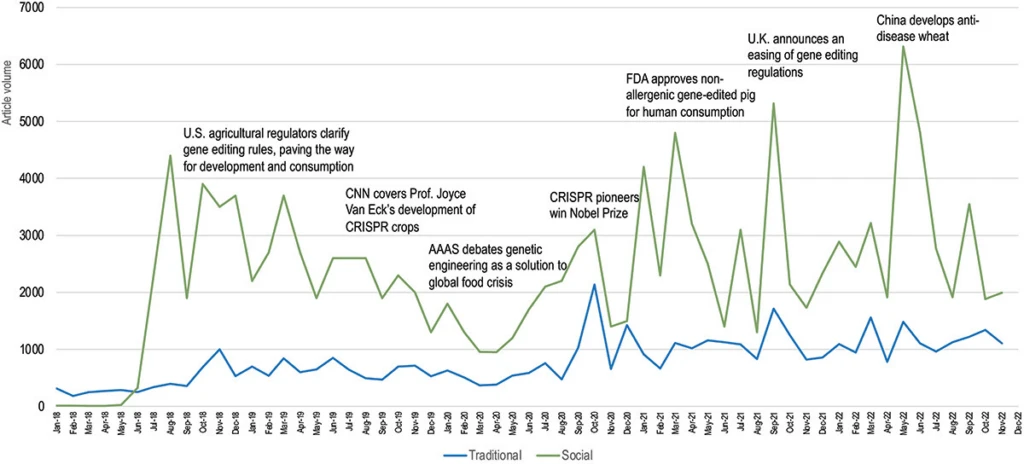 For gene editing, we analyzed 48,500 traditional media articles and 138,200 social media posts over a five-year period between the dates of January 1, 2018 and December 31, 2022. To quantify volume, we looked at the total number of articles for print and online news, and the number of original posts and comments/reposts for social media. In order to quantify audience, we use the term “gross reach” to describe the number of possible audience exposures to a media item based on an audited system for traditional media, and on total posts multiplied by the number of followers for social media. For sentiment analysis, we assign a percentage reach of “pro,” “anti,” “neutral” and “mixed”-tagged media items, with initial dictionary-based computer natural language processing. Sentiment was then validated by humans reading sample articles, or in most cases a comprehensive list of articles representing all available content within a date range and a defined set of articles. We assign an overall percentage favorability by combining “pro” and “neutral” sentiment. The neutral designation for factual content is considered favorable because factual messaging is likely to improve awareness, to educate, and to persuade readers of the value of this technology.