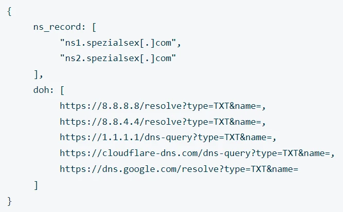 With the help of the configuration, the implant establishes communication with malicious nameservers using DoH requests.