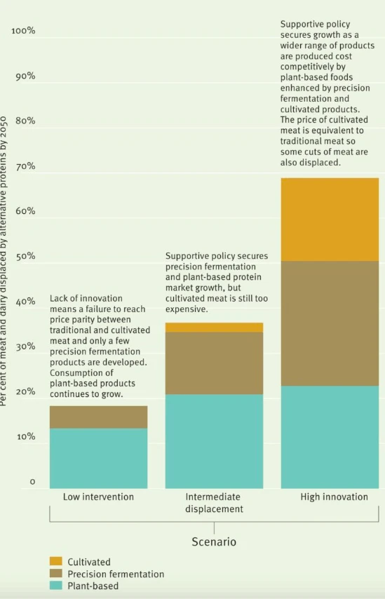 The extent of displacement relies on three factors: price parity (which will speed up if inflation keeps disproportionately affecting animal proteins), policy (in terms of government funding, infrastructure and regulatory support), and taste (the report argues precision-fermented and cultivated proteins need to be successful to replace cuts of meats and cheese that plant-based products may not).