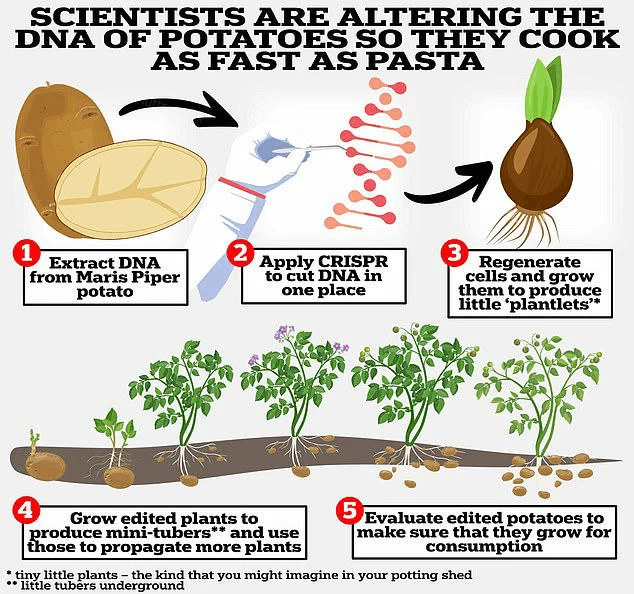 Using gene editing, the scientists plan to make tweaks to the part of the spud’s DNA that controls how quickly the vegetable’s cells soften.