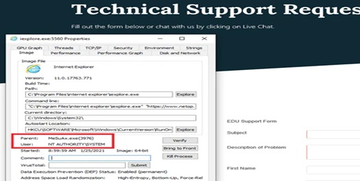 When the user clicks on the support button, it opens IE directly into a support web form. The issue, however, privileges are never dropped, resulting in the IE process being run as a System because the Netop student client is also run as System.