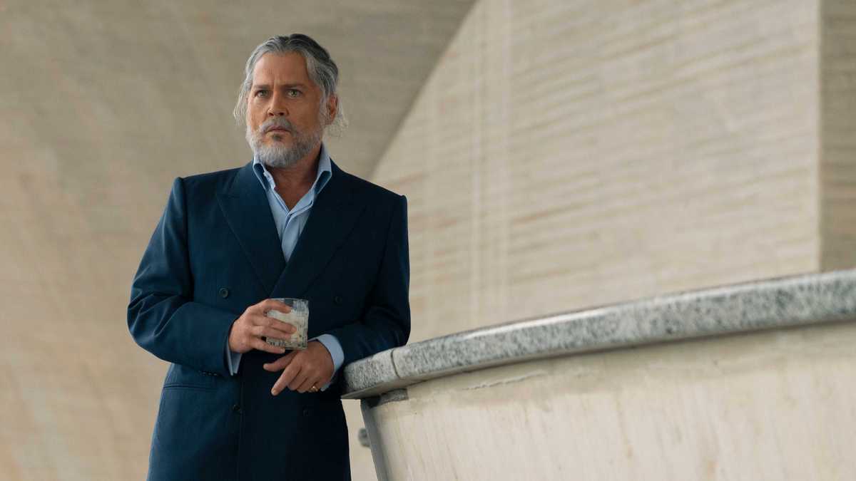 Now, Lionsgate has revealed the first image for Day Drinker. The image is a solo look at Depp in his role in the film. He sports gray hair, including a beard and mustache, and wears a navy blue suit. He holds a drink in his hand and looks towards something off-screen. Check it out below: