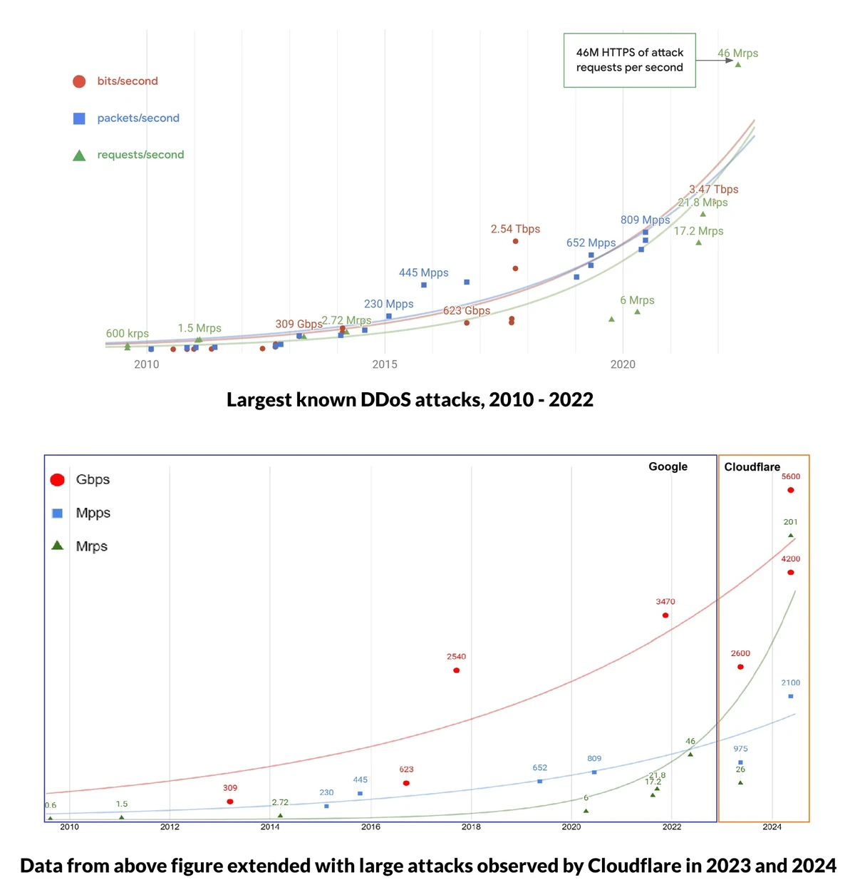 - Requests per second (rps): Experienced the most dramatic growth, soaring from 6 Mrps in 2020 to an unprecedented 201 Mrps in September 2024, representing a 70-fold increase since 2014.