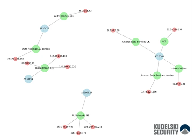 The analysis revealed a network of interconnected IP addresses mostly linked to a specific hosting provider.