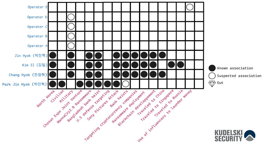 The activity matrix shows how researchers can map an attacker’s organization, identify operational hierarchies, and distinguish between military and civilian operations conducted by groups like Lazarus.