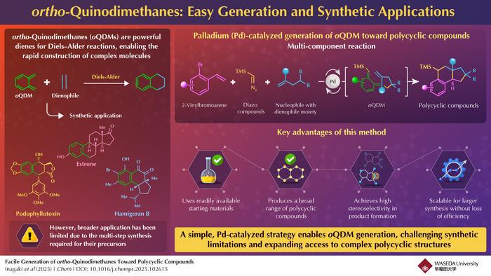 Addressing this longstanding synthetic conundrum, an innovative research team led by Professor Junichiro Yamaguchi from Waseda University, in collaboration with Dr. Kei Muto at the Institute of Transformative Bio-Molecules, Nagoya University, has unveiled a groundbreaking palladium-catalyzed multicomponent reaction capable of generating oQDM species in situ. This transformative methodology elegantly orchestrates the union of 2-vinylbromoarenes, diazo compounds, and carbon nucleophiles that contain dienophile moieties, thereby facilitating a streamlined access route to complex polycyclic structures without the necessity of isolating or stabilizing the highly reactive intermediate.
