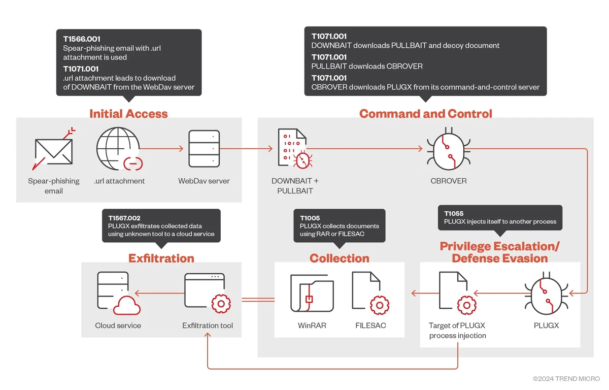 Their campaign begins with a spear-phishing email containing a .url attachment, which triggers a multi-stage malware deployment process.