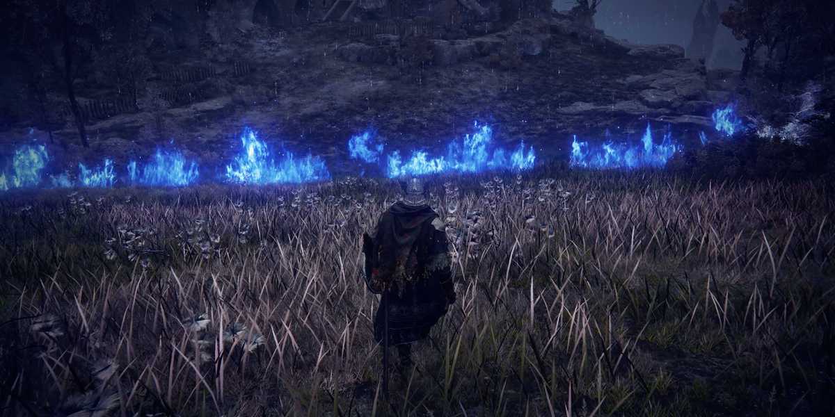 The chaotic skirmish that followed didn't last very long, though, because the Night's Tide started to come in. Night's Tide is the name given to Nightreign's gradually closing circle of blue flames, sparked by a sinister, magical rainfall. Anyone who's dabbled in battle royales will be familiar – it shrinks the available map in stages, dealing gradual damage to anyone caught in the rain. I was at first disappointed our spontaneous dual-boss fight was interrupted, but it led to perhaps the most memorable sequence from my early look at Nightreign.