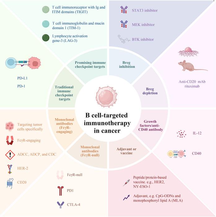 Innovations in monoclonal antibody engineering, including Fc domain modifications, have been developed to fine-tune effector functions such as complement activation and Fc receptor engagement, enhancing anti-tumor activity with improved specificity. Additionally, adjuvant therapies employing CD40 agonists and Toll-like receptor 9 (TLR9) stimulants augment B cell responses, amplifying antigen presentation and antibody production. Vaccination approaches targeting tumor-specific antigens like HER2 and NY-ESO-1 also stimulate robust B cell-mediated immunity. Conversely, targeted inhibition of Bregs via Bruton’s tyrosine kinase (BTK) inhibitors or blockade of STAT3 and MEK signaling pathways has demonstrated promising tumor-suppressive effects in preclinical models.