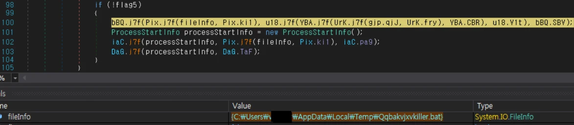 A BAT file is generated by the malware that has been loaded and executed in the %temp% directory, by which certain processes and services can be shut down.
