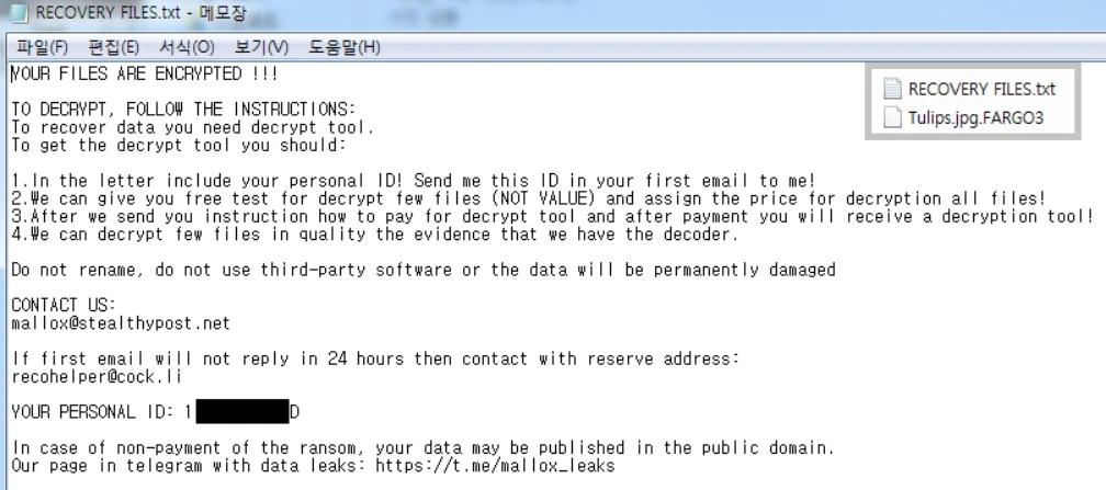 As soon as the encryption process is completed, the locked files are renamed with the extension “.Fargo3” which is added by the unit itself. Afterwards, the ransom note is generated by the malware.