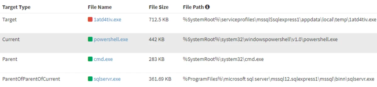 MS-SQL downloads a file based on .Net into the system through the use of cmd[.]exe and powershell[.]exe through its processes.