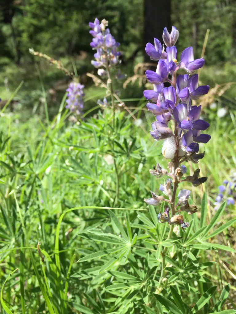 As for the climb up the Kettle Crest, it continues on. Must be well over 2,000 now. That’s easily three. This must bethe top. The lupines here were as enfeebled as my rubbery legs and as scattered as my increasingly desperate thoughts about how little water I had, why I failed to bring a rain jacket, and that ominous creak in my bottom bracket. I was abandoning botany and hope even as I approached several Evergreen members, whose trail-building instincts led them to place bold stick-arrows at the actual high point of the route, at a turn I would have otherwise missed. After a brief break, the thrilling descent of Jungle Hill through ponderosa stands and side-hill meadows, over meandering creeks and down deep switchbacks, had me grinning wildly while watching the thick carpet of lupines return in a blur.