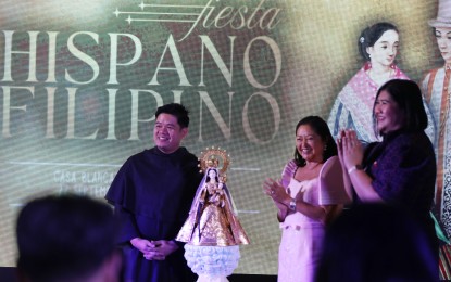 PATRONESS. Rev. Fr. Edwin Hari, OSA, presents an image of Nuestra Senora de la Consolacion y Correa to First Lady Liza Araneta-Marcos during the Fiesta Hispano-Filipino at Casa Blanca, Intramuros, Manila on Friday (Sept. 27, 2024), with Intramuros Administrator chief Joan Padilla (right). The event, a culminating part of the month-long Fiesta de Intramuros that honors the walled city’s patroness, highlighted the centuries-old bond between Spain and the Philippines. (PNA photo by Jess Escaros Jr.)