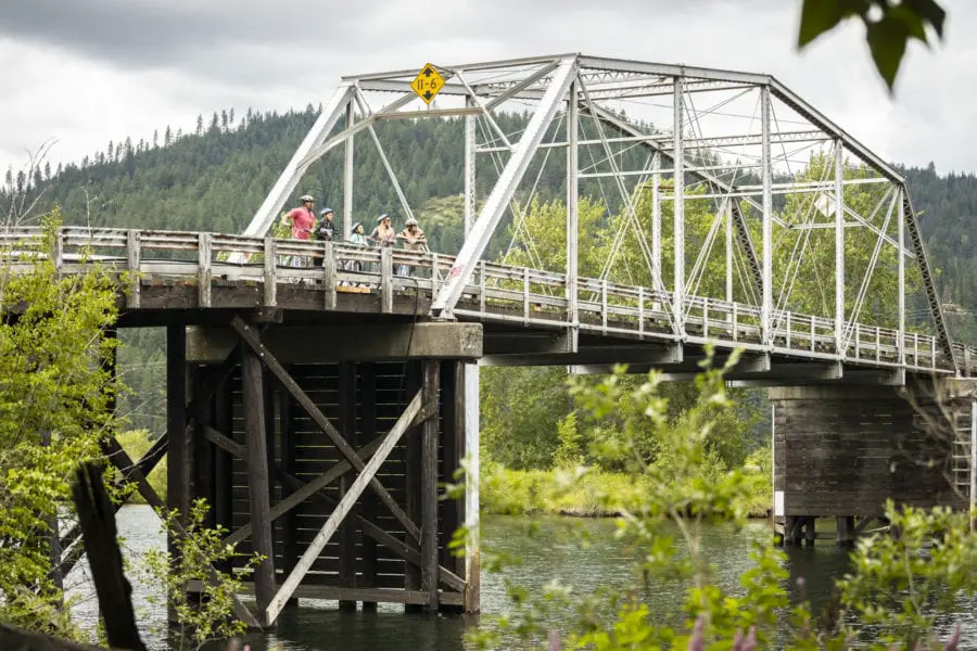 Find all the info you’ll need to plan your ride on the Friends of the Trail of the Coeur d’Alenes website. Avid local rider and friends group president Rick Shaffer shared a few of his favorite sections of the trail. “You don’t need to do a huge section or the whole trail,” explains Shaffer. He suggests the 10-mile stretch along Lake Coeur d’Alene or the 35-mile section along the Coeur d’Alene River between Pinehurst and Harrison. “That section is like biking through a zoo. Elk, moose, deer, hundreds of birds, and there is water on both sides of the trail in some places. It’s just incredible.” Shaffer also recommends the stretch from Mullan to Osburn in the Silver Valley. “It’s downhill, in the trees, and it follows some whitewater sections along the river.” Note that there will likely be snow on the trail at least in places between Wallace and Mullan, with the snow lingering in the Mullan area at least through April (spring 2022).