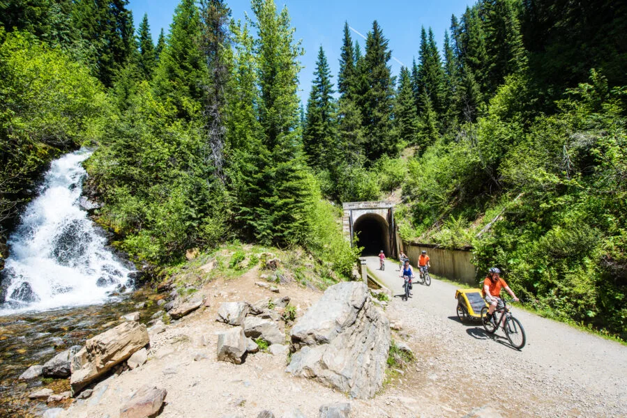 To make the ride easier, there is a shuttle service for a small fee that will bring you and your bike back to the top of the trail after your ride is done. The route is famous for St. Paul Pass, or Taft Tunnel, which is a 1.66-mile long tunnel that goes under the Bitterroot Mountains at the state line between Idaho and Montana (bring your bike light!). You can also rent bikes and child trailers and other gear from Lookout Pass.