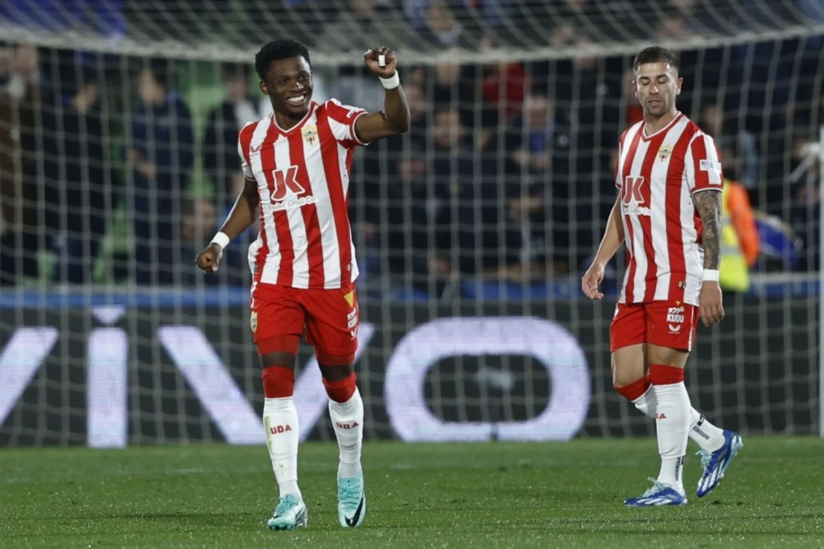 epa10994993 UD Almeria's Belgian forward Largie Ramazani (L) celebrates the opening goal with his teammates during the LaLiga soccer match Getafe vs Almeria in Getafe, Spain, 25 November 2023. EPA-EFE/Rodrigo Jimenez