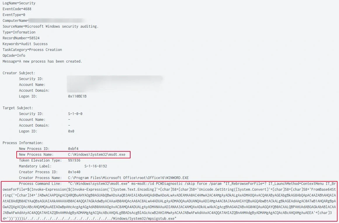 A new instance of the sdiagnhost.exe is spawned as soon as a MSDT payload is executed. The Follina payload was ultimately invoked by this process, and it was the end result of this process.