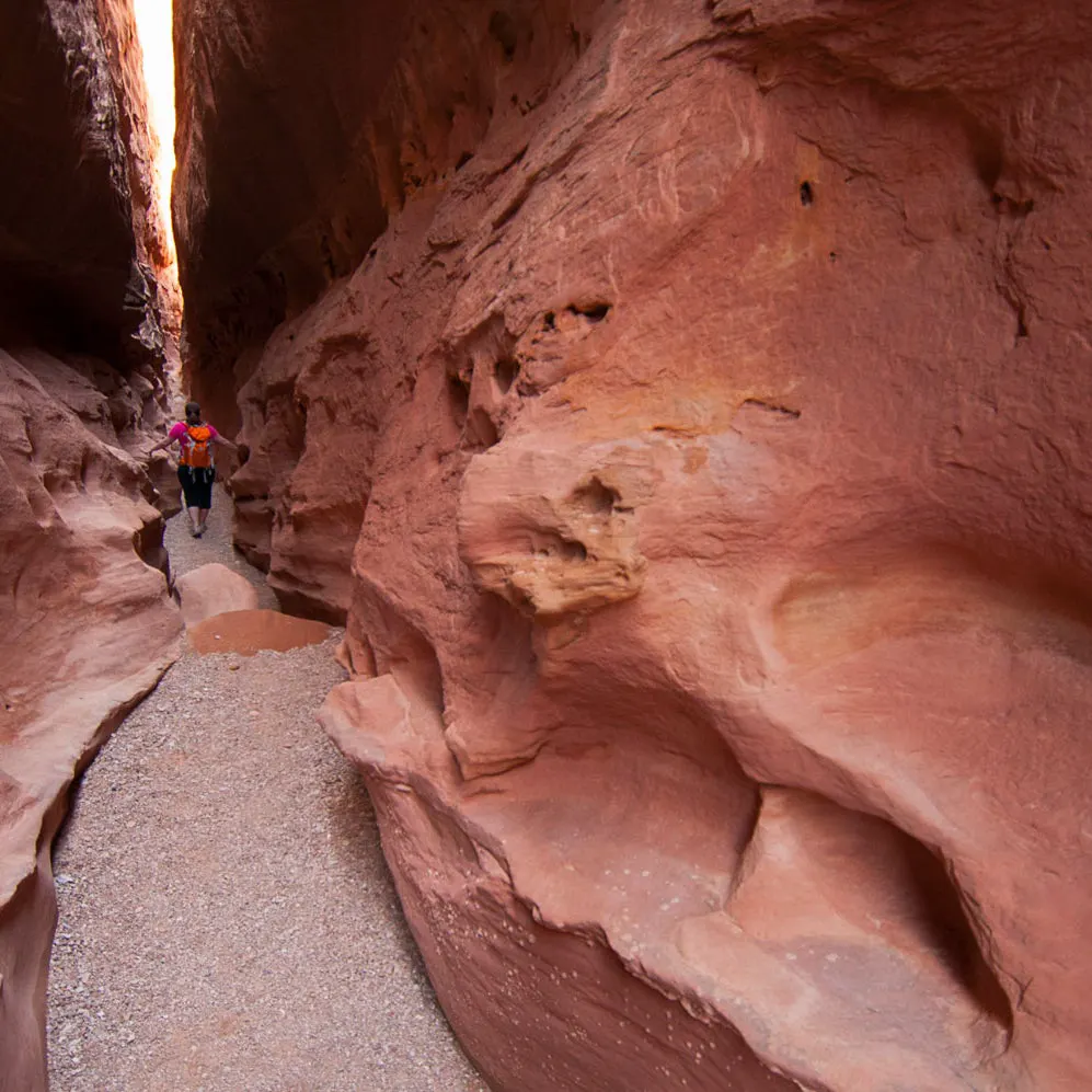 From above, the canyon known as “Goblin’s Lair” or “Chamber of the Basilisk” might not look like much more than a 4 to 6 inch hole in the earth. But if you walk 1.2 miles (one-way) along the Carmel Canyon and Molly’s Castle Overlook Trails, the unique sealed slot opens up into a deep chamber with arched cathedral-like ceilings. The canyon floor is completely walkable, which Kelsey said makes it the perfect short hike for families. More experienced canyoneers can head southeast from the same trailhead to the other side of the cavern and make an 80 foot rappel into the abyss, climbing out via the hiking trail.