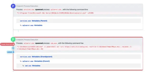 - Look for PowerShell processes that spawn cmd.exe with sqlserver.exe as a parent process