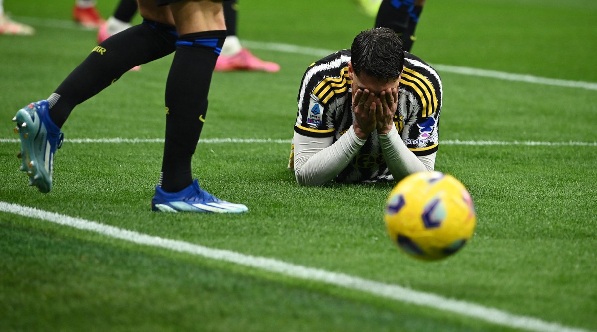 Juventus' Serbian forward #9 Dusan Vlahovic reacts during the Serie A football match between Inter Milan and Juventus at the San Siro stadium in Milan, on February 4, 2024. (Photo by Isabella BONOTTO / AFP) (Photo by ISABELLA BONOTTO/AFP via Getty Images)