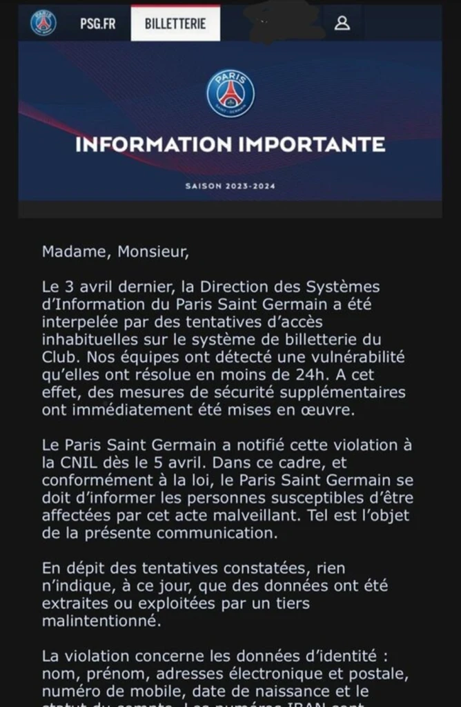 Adhering to regulatory obligations, PSG notified the CNIL (Commission Nationale de l’Informatique et des Libertés) of the breach by April 5.